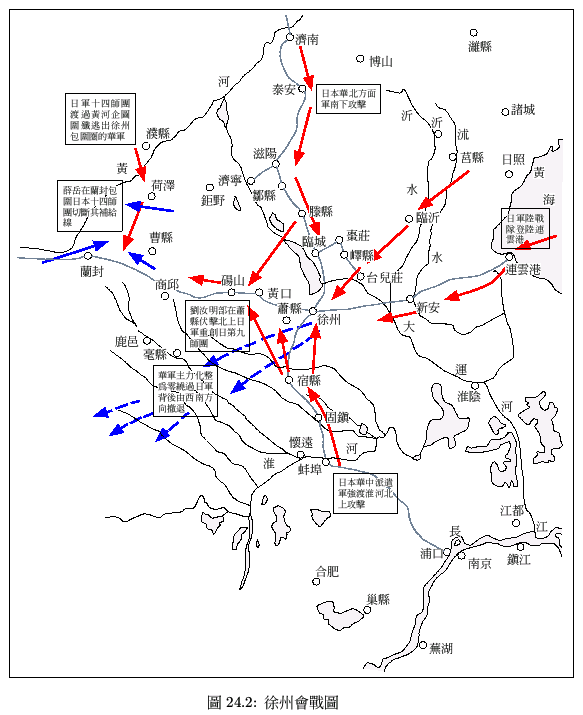而华中派遣军则负责由南向北进攻,第十三与第九师团强渡淮河,北攻徐州, 主力是指向经由宿县,而扑向徐州西方的陇海铁路要站砀山,准备和华北方面军 的主力在此会师,以达成切断华军西撤通路、在徐州附近围歼大量华军的战略目 标,而华中派遣军为了争功,特别又增派第三师团以及两个支队北上,直逼徐州 ,此外,日军又出动陆战队在登陆连云港,日军对於徐州,进行了三面包围,并 且急攻徐州的西部,日军的作战计划是非常的明显,就是要以南北夹击的作战方 式,将作战的重点放在截断华军与西方连络的交通补给线,然后在徐州西方,成 功的围歼蒋介石刚刚完成整补的华军。